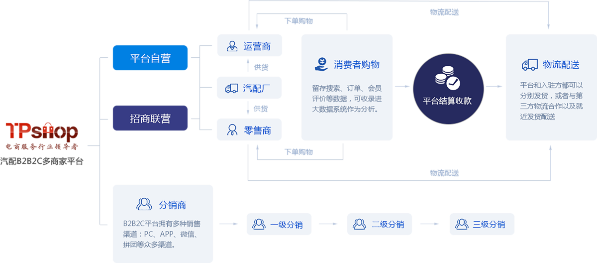 TPshop針對當(dāng)下汽配電商行業(yè)的痛點和傳統(tǒng)4S店銷售模式的優(yōu)勢,以“B2B2C+O2O”的理念